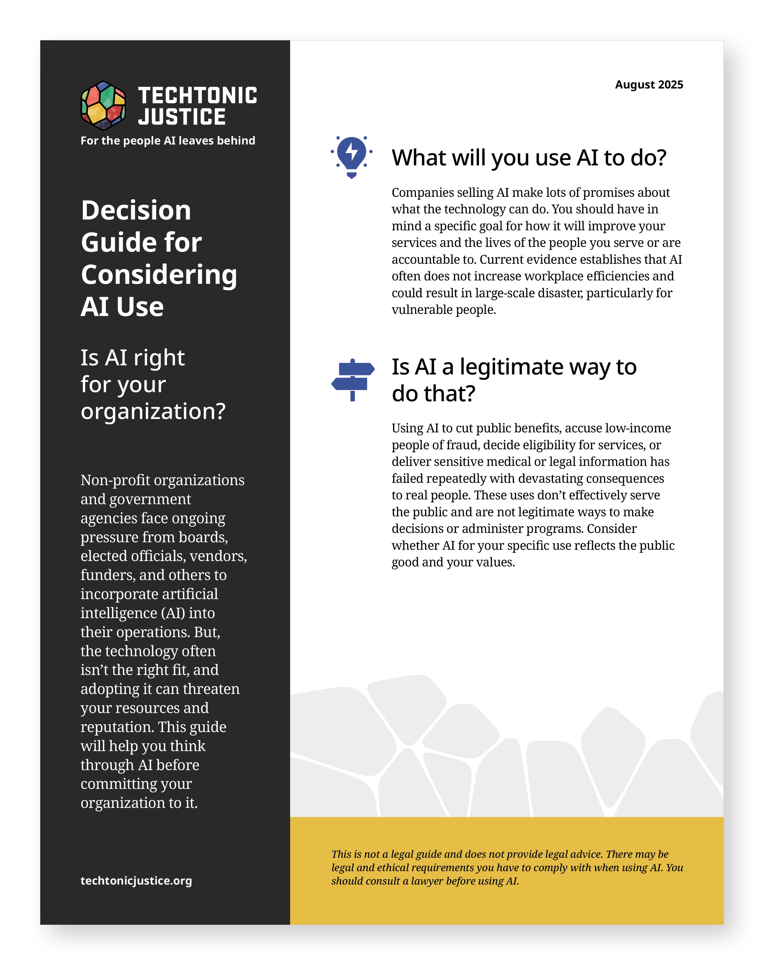 TechTonic Justice resists the harms that AI inflicts on low-income people nationwide by supporting, coalescing, and catalyzing legal aid programs, their client communities, and other frontline organizations.